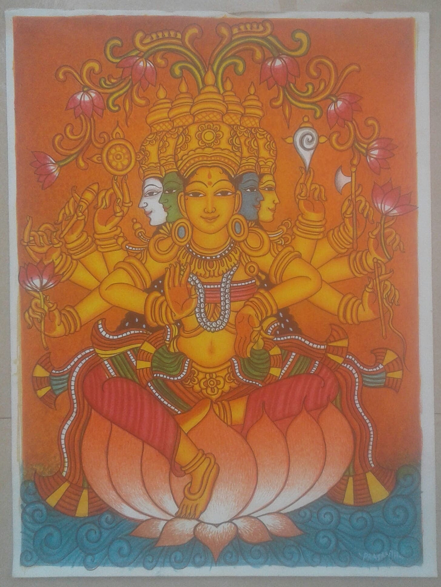 Devi,Durga,Saraswati,Panchamukha Gayathri,Traditional Kerala Mural Style painting Goddess,Original Mural Painting, Canvas Rolled, Wall Decor